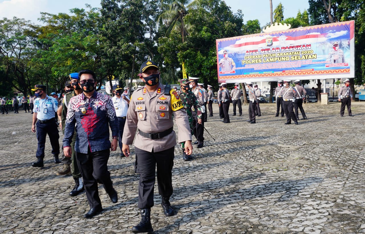 KALIANDA (RO) - Kepolisian Resort (Polres) Lampung Selatan menggelar apel gelar pasukan dalam rangka Operasi Patuh Krakatau 2020 di Lapangan Korpri Pemerintah Kabupaten (Pemkab) Lampung Selatan, Kamis (23/7/2020).